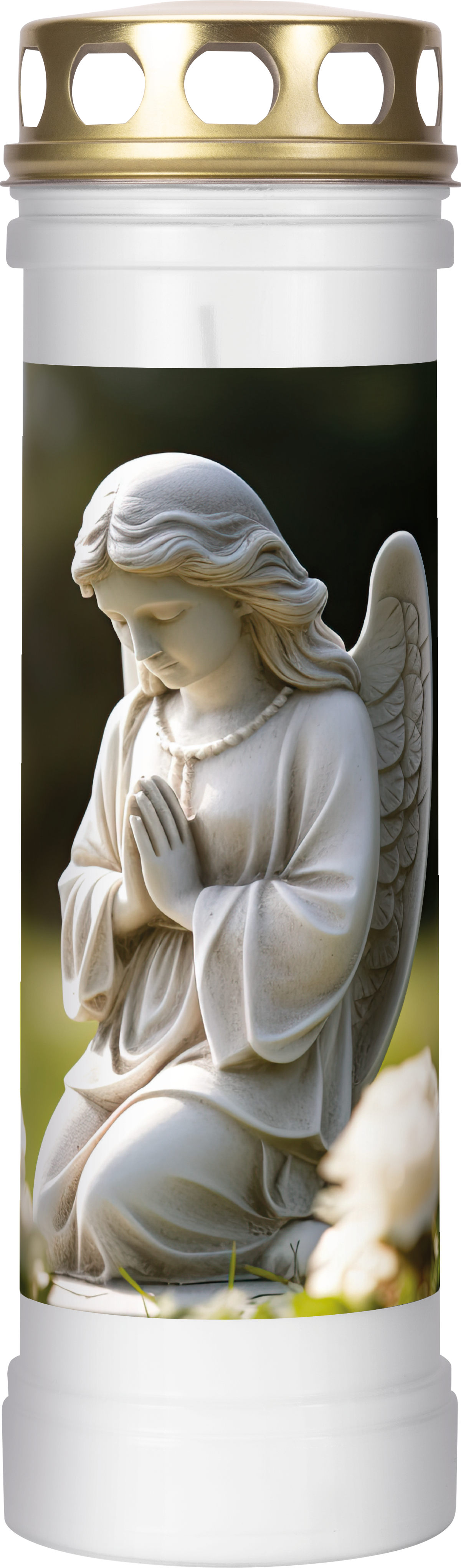 A filled plastic gravelight with a gold-colored metal lid, featuring an Angel design, symbolizes the solemnity and quiet reflection of remembrance. The subdued colors and clear motif give it an elegant character.