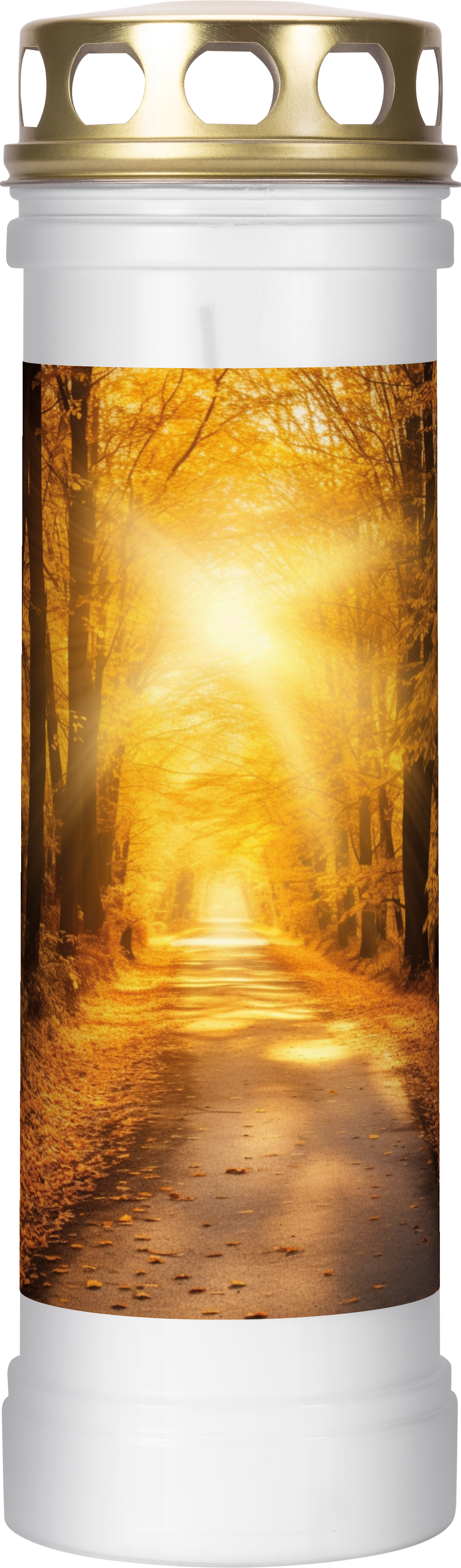 A filled plastic gravelight with a gold-colored metal cap, featuring the motif of a luminous path among trees, is a symbolic memorial light expressing remembrance, hope, and spiritual peace. The image of the illuminated avenue in warm, golden tones gives it a solemn and reflective character.
