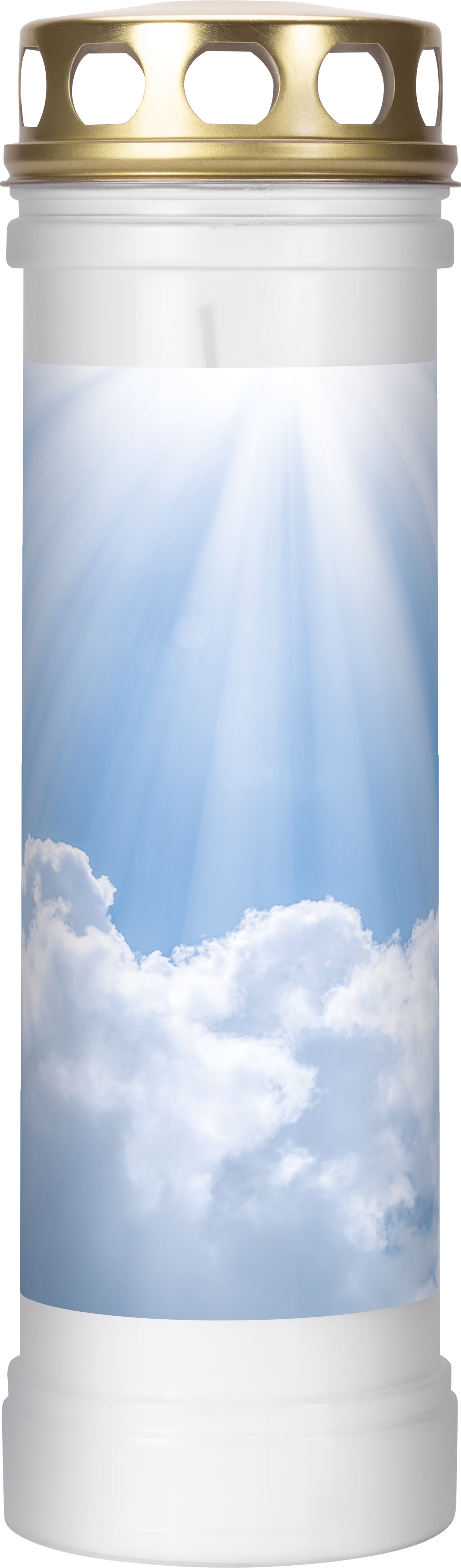 A filled plastic gravelight with a gold-colored metal cap, featuring a sky and rays of light design, refers to hope and the spiritual dimension of remembrance. The light, calm colors give it a gentle character.
