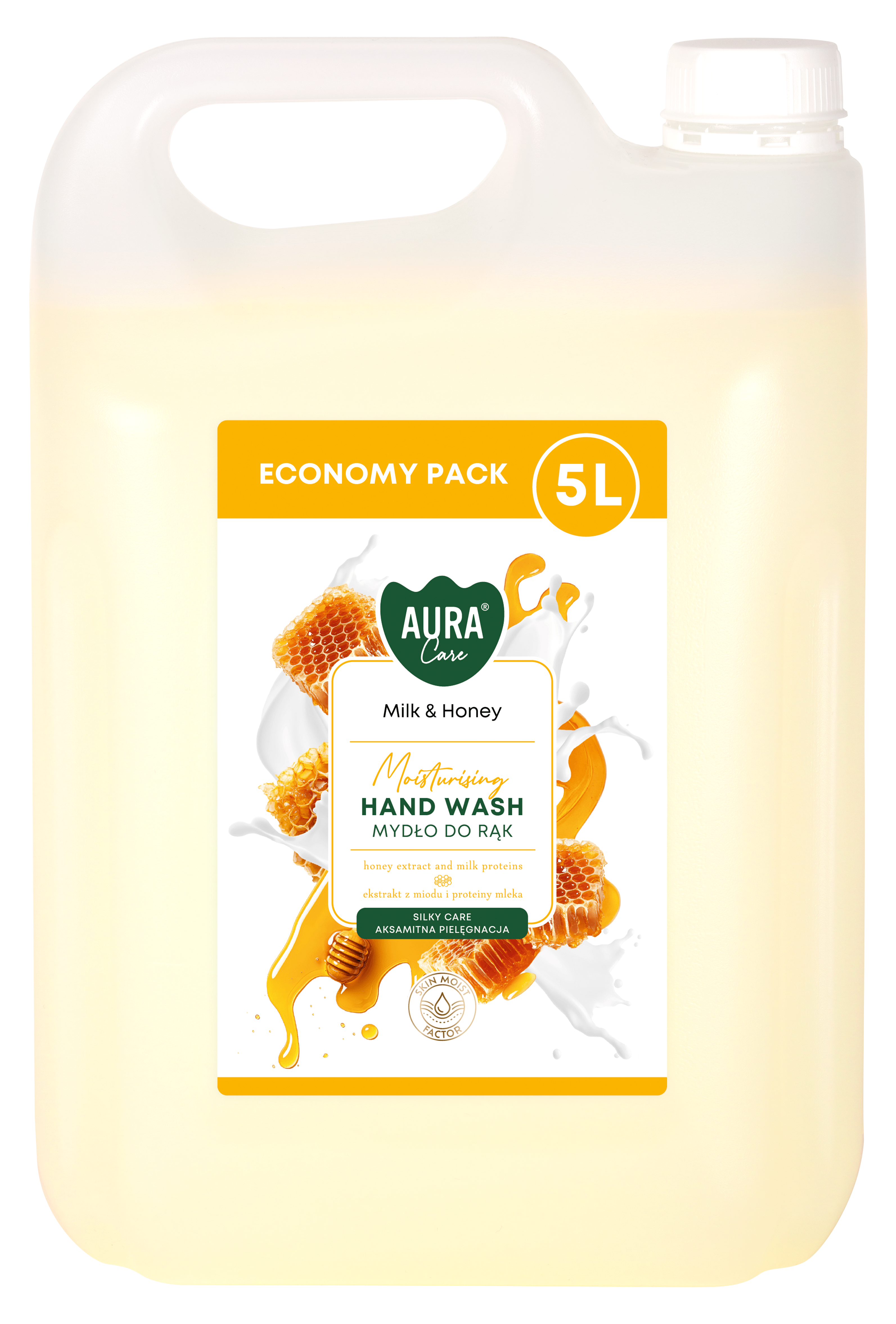 Aura Care Milk and Honey hand wash refill in a large 5 L container, combines efficiency with exceptional care. Creamy consistency, rich in a moisturizing complex and glycerin, as well as cotton milk and milk proteins, effectively cleanses, nourishes, and leaves skin velvety smooth.