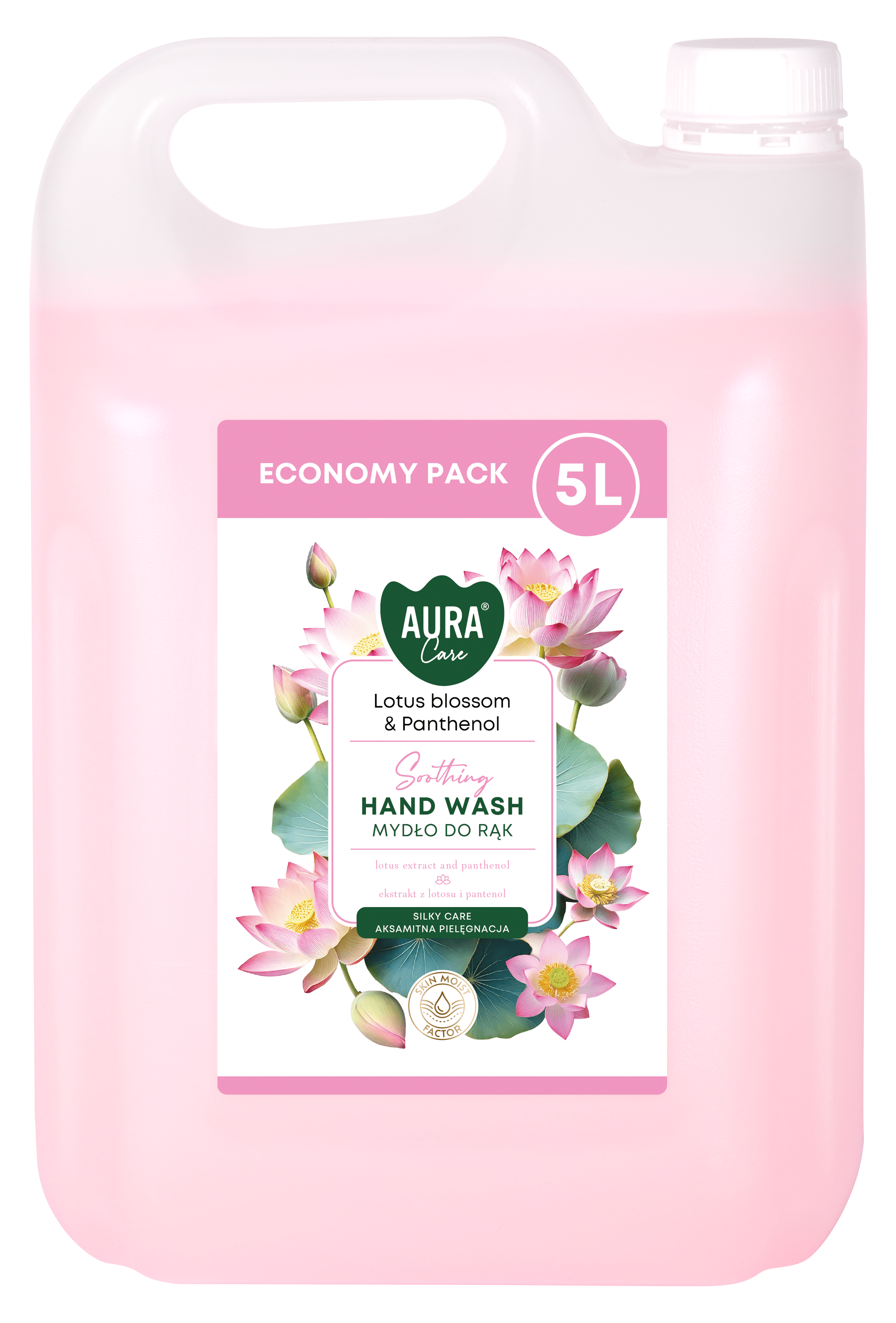 Aura Care Lotus blossom and Panthenol hand wash refill in a large 5 L container, combines efficiency with exceptional care. Creamy consistency, rich in a moisturizing complex and glycerin, as well as cotton milk and milk proteins, effectively cleanses, nourishes, and leaves skin velvety smooth.