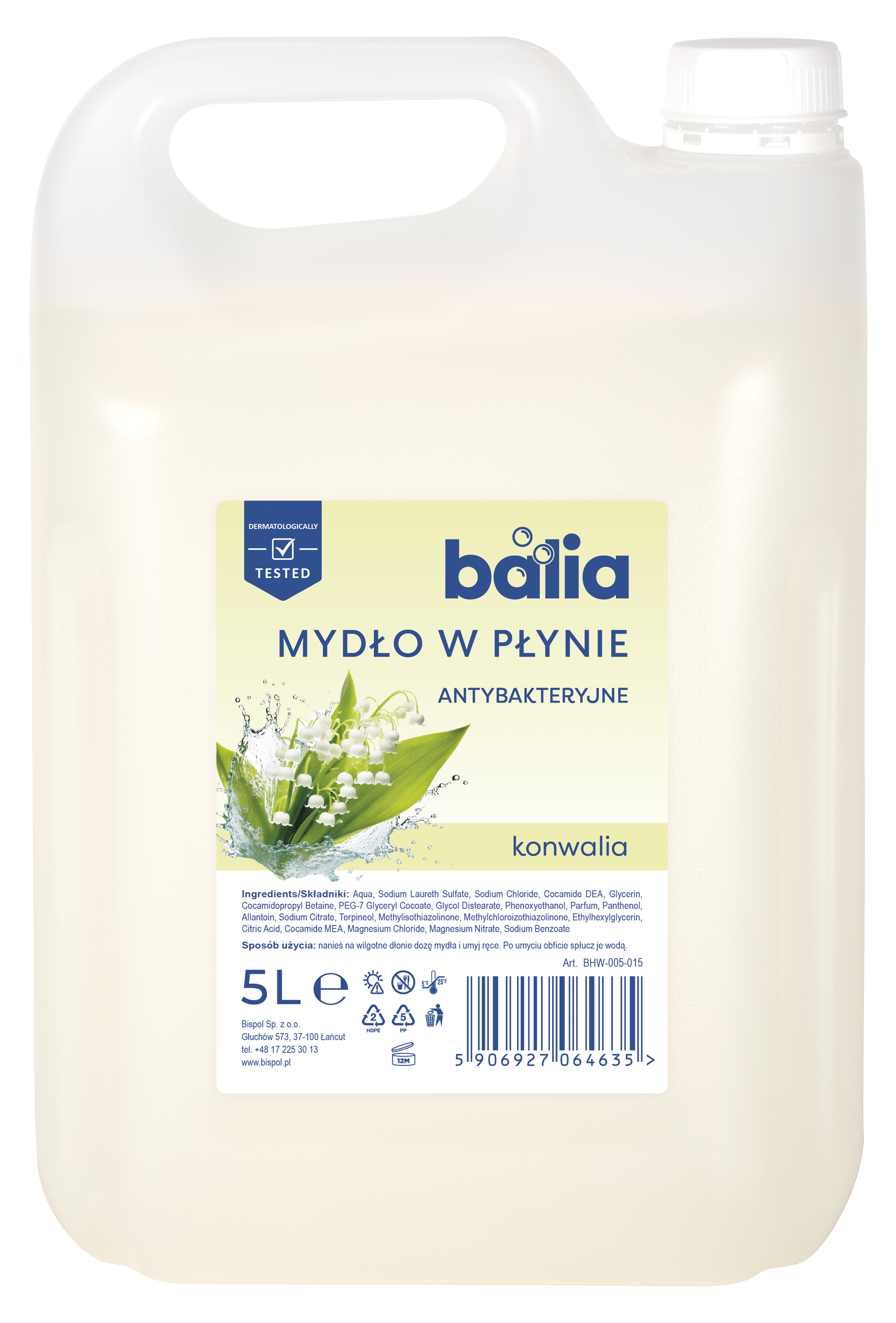 Balia Lily of the valley antibacterial hand wash, 5 L capacity, is an efficient and economical product designed for everyday use in companies, institutions, and industrial plants. It effectively cleanses hands, while the addition of glycerin, panthenol, and allantoin nourishes hands and prevents them from drying out. The delicate lily of the valley scent leaves hands feeling fresh and clean after every use.