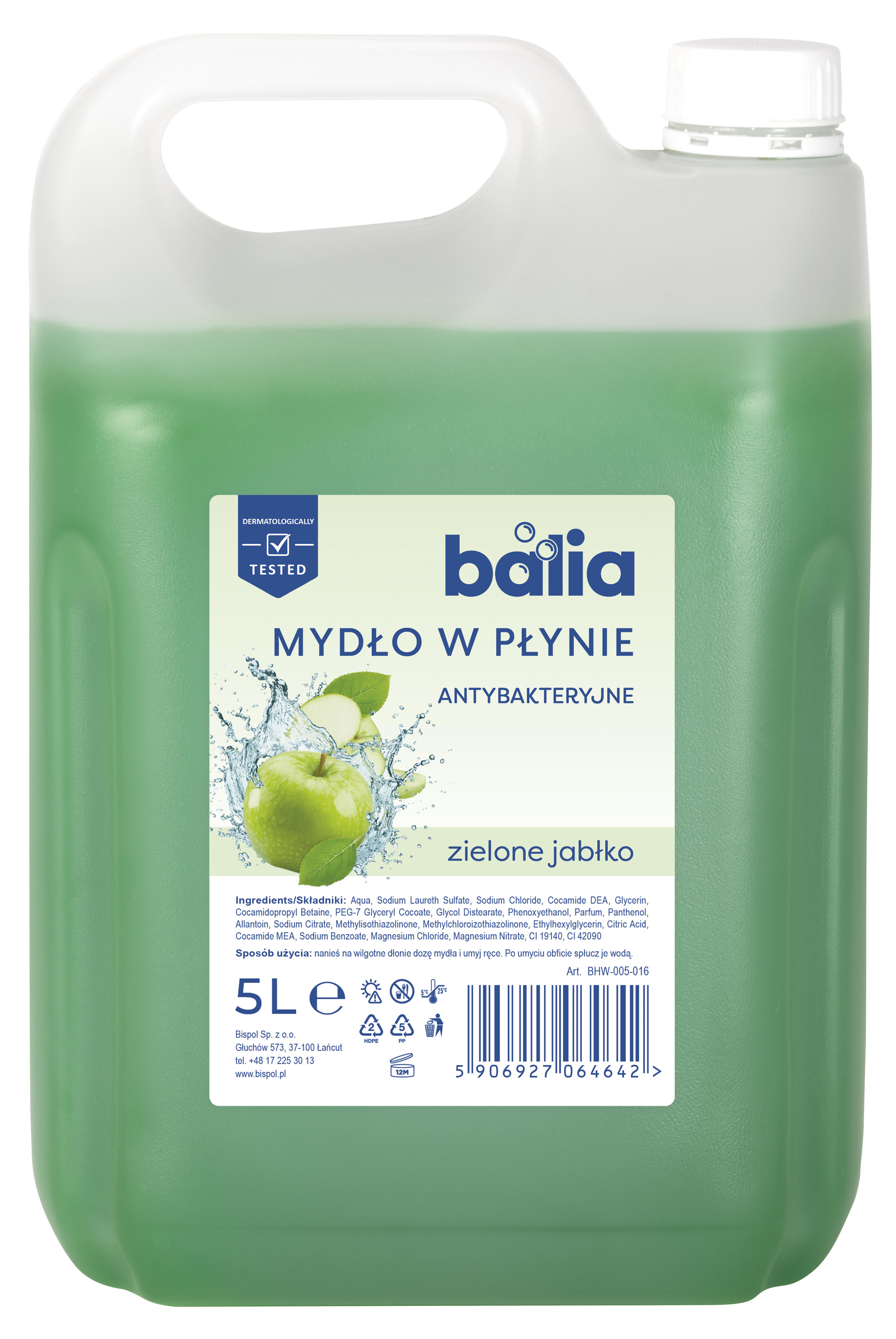 Balia Green Apple antibacterial hand wash, 5 L capacity, is an efficient and economical product designed for everyday use in companies, institutions, and industrial plants. It effectively cleanses hands, while the addition of glycerin, panthenol, and allantoin nourishes hands and prevents them from drying out. The refreshing green apple scent leaves them feeling fresh and clean after every use.